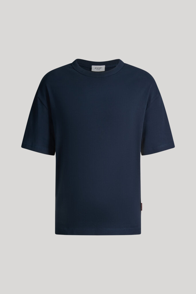 Vācu modes zīmola Joop! vīriešu T-krekls tumši zilā krāsā. Izgatavots no 100% kokvilnas. Papildināts ar kontrastējošu zīmola emblēmas akcentu sānu vīlē.