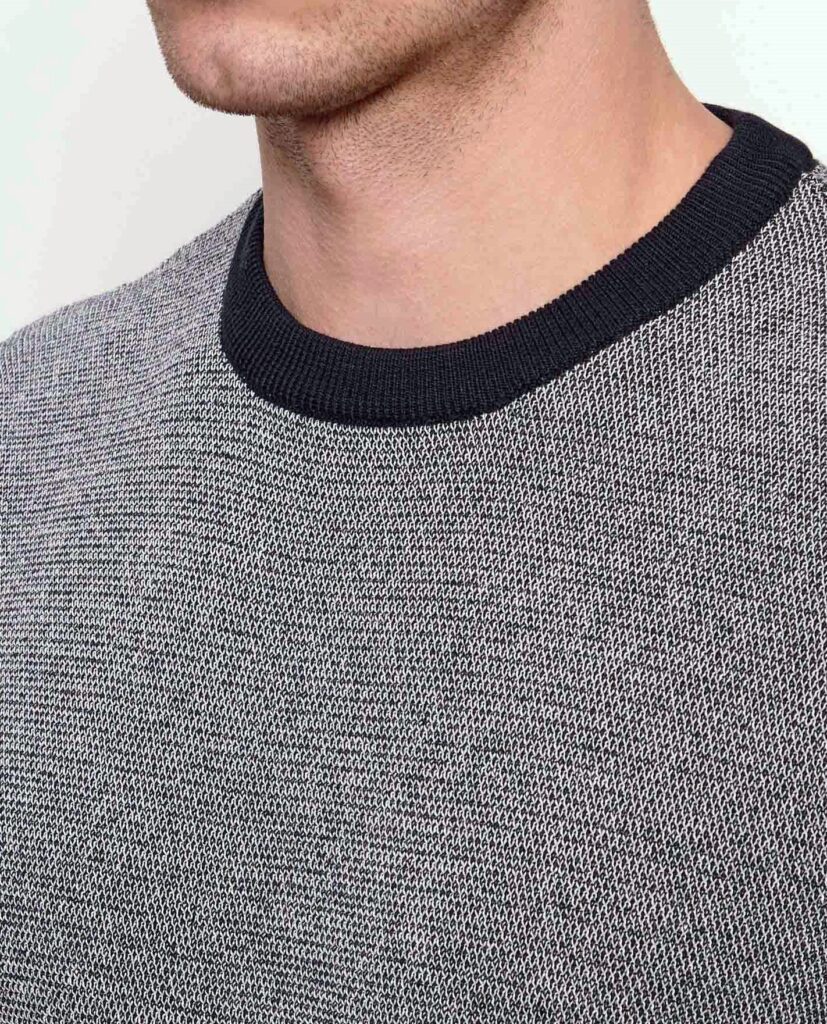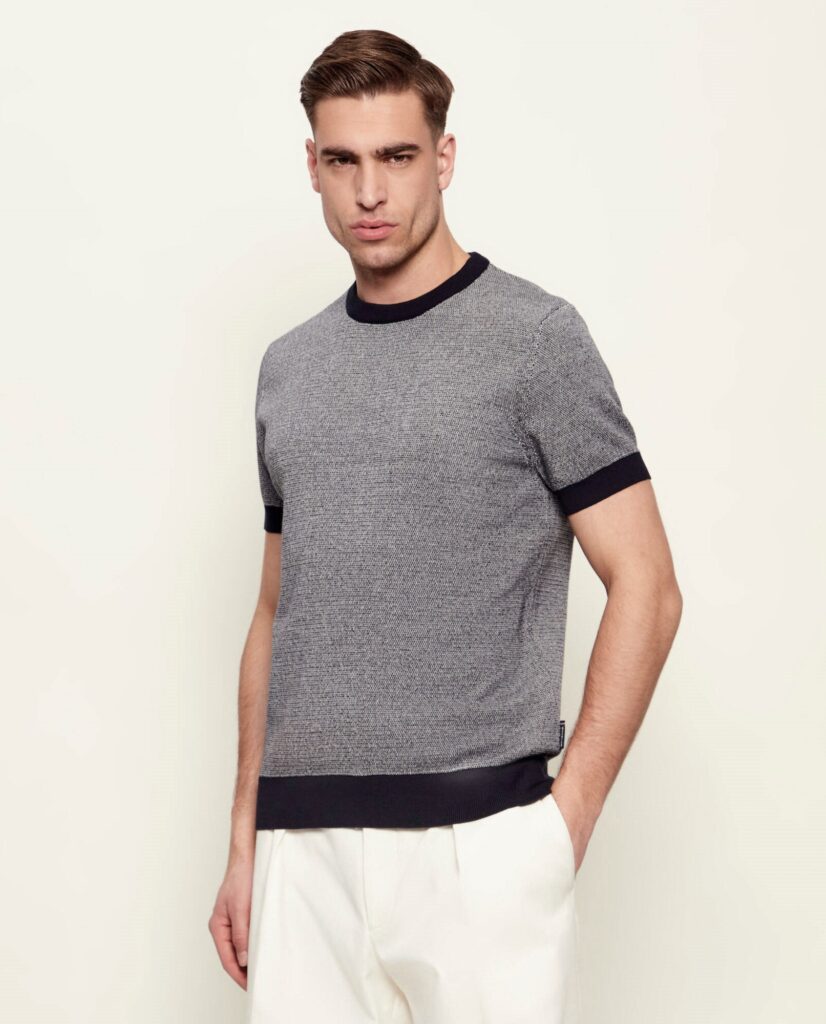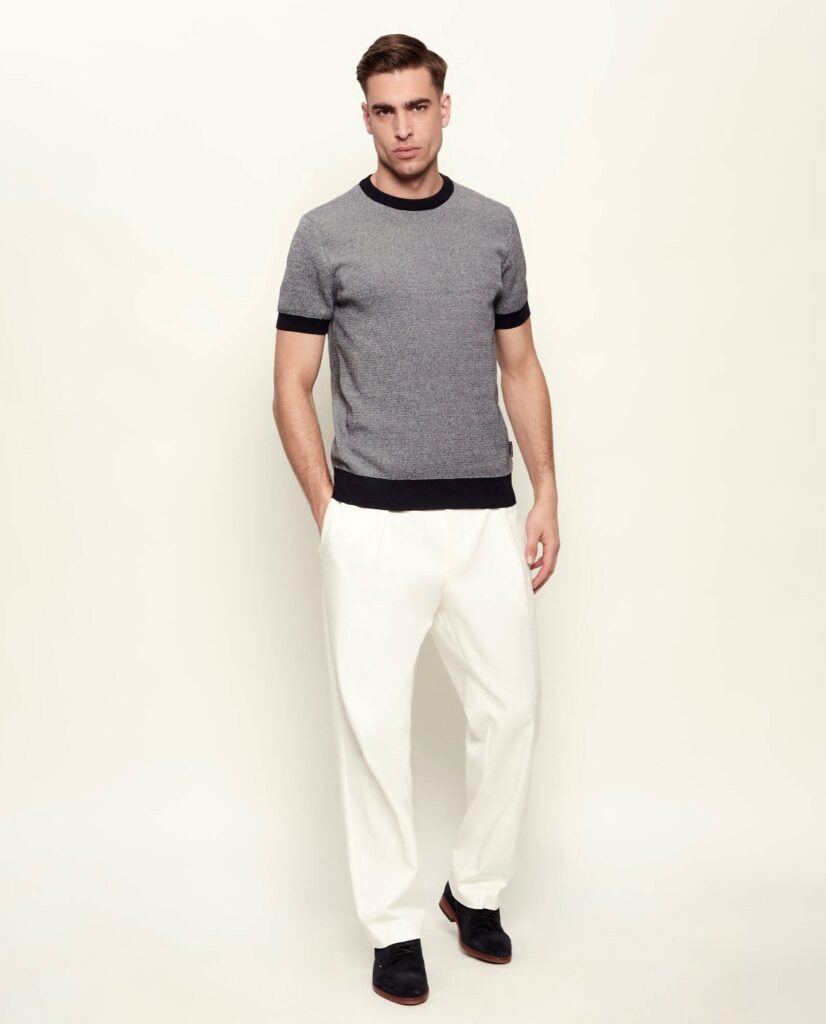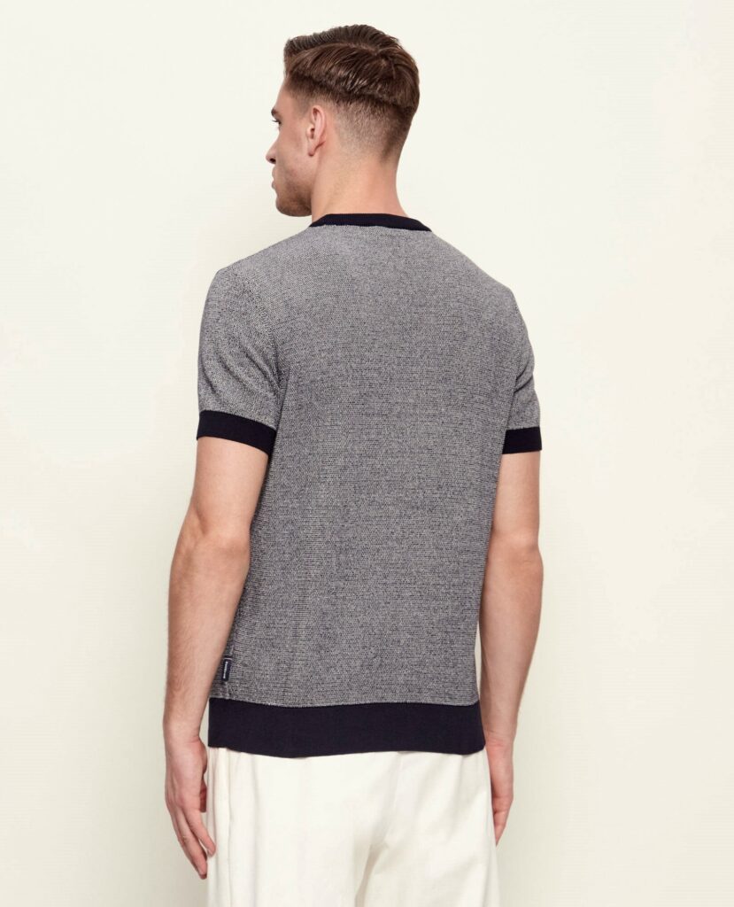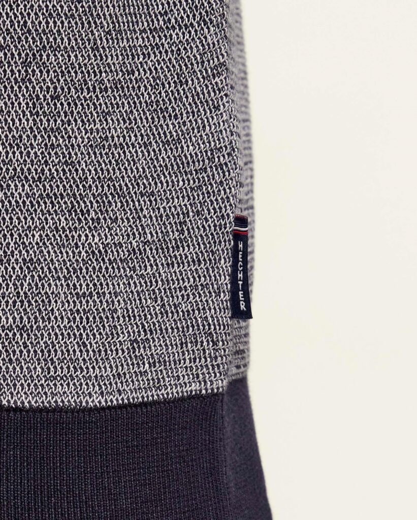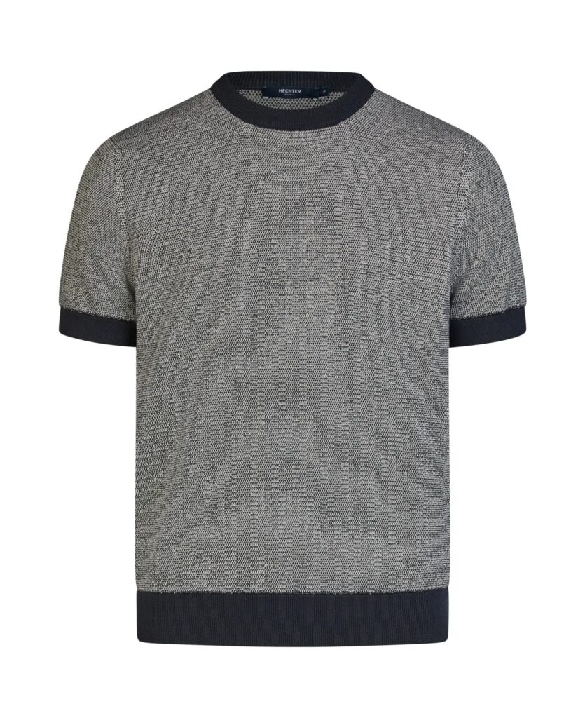 Franču zīmola HECHTER PARIS tumši zils vīriešu T-krekls ar smalki raibu divu toņu tekstūru un tumšāku vientoņa apdari. Izgatavots no 100% kokvilnas ar raupju tekstūru. Papildināts ar smalki rievotu apdari un emblēmas akcentu sānu vīlē.