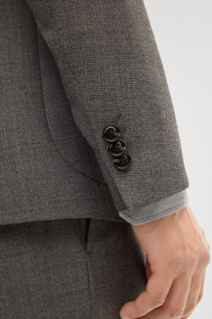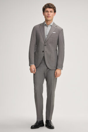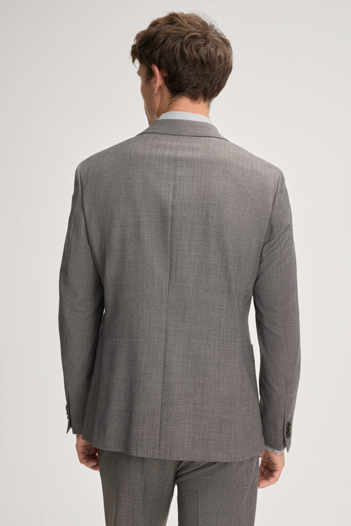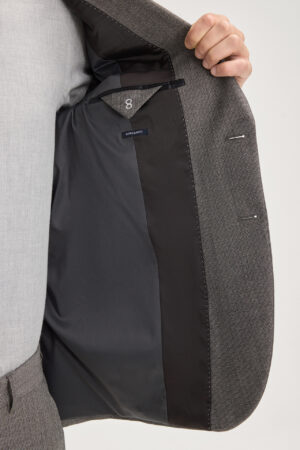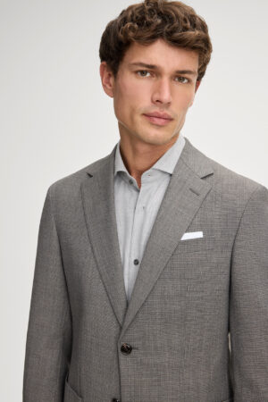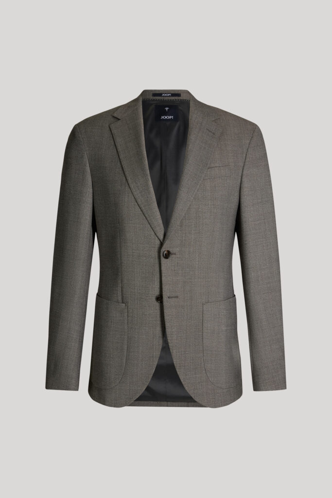 Vācu modes zīmola Joop! pieguļoša vīriešu žakete ar smalki raibu struktūru silti pelēkā taupe tonī. Izgatavota no viegli elastīga vilnas maisījuma auduma. Papildināta ar klasiskiem atlokiem, uzšūtām sānu kabatām un šķēlumiem mugurpusē.