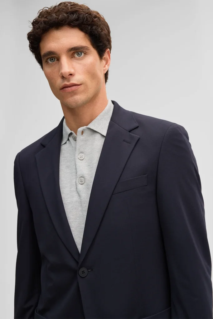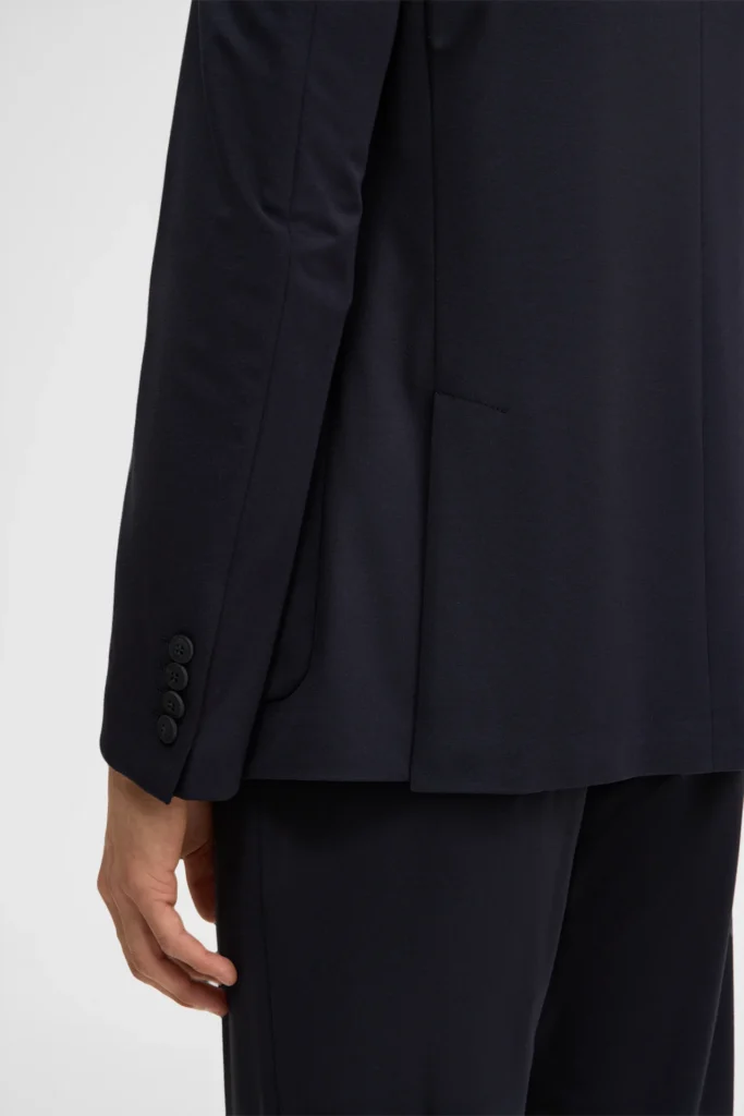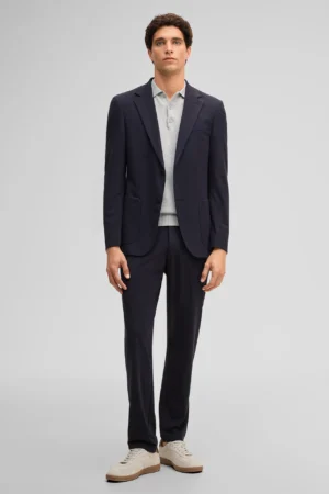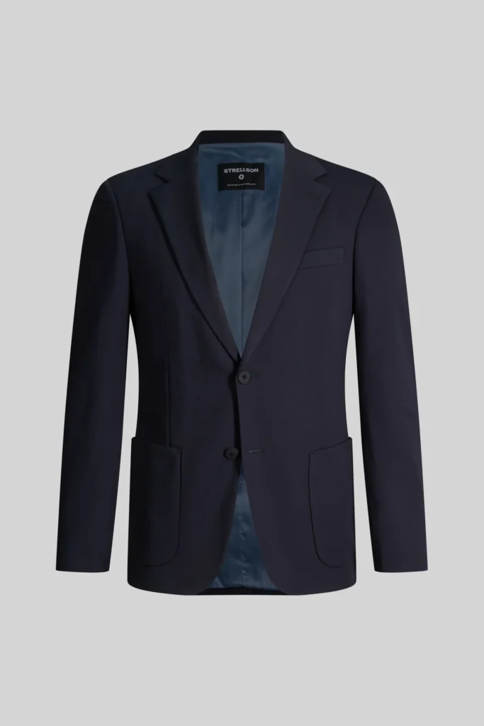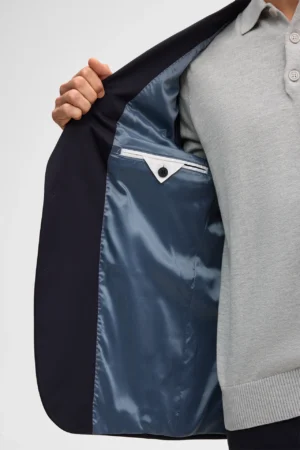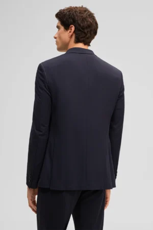Šveices modes zīmola Strellson viegli pieguļoša vīriešu uzvalka žakete tumši zilā krāsā. Izgatavota no plāna un elastīga viskozes maisījuma materiāla. Papildināta ar uz šūtām sānu kabatām un šķēlumiem mugurpusē.