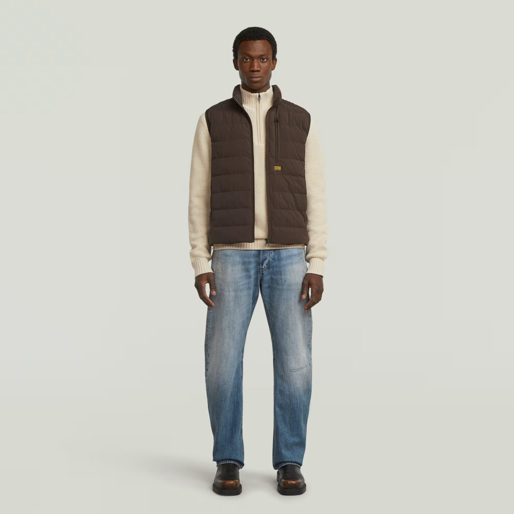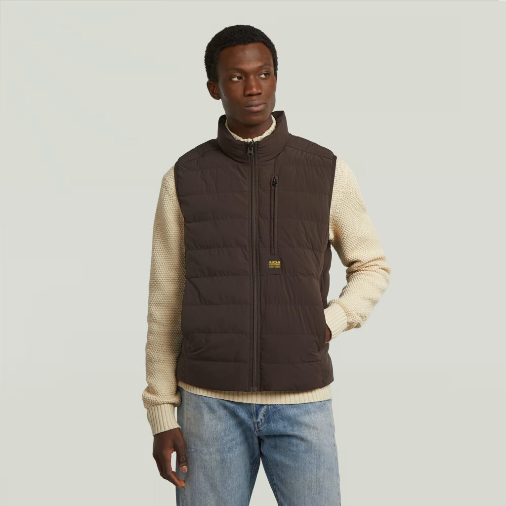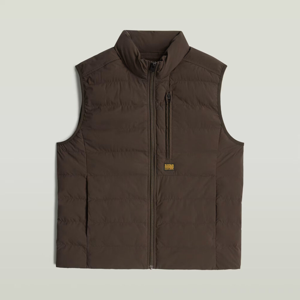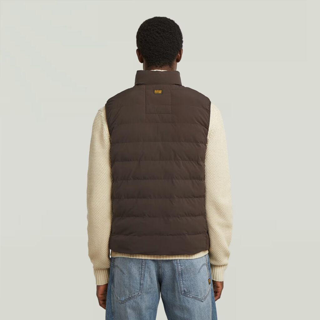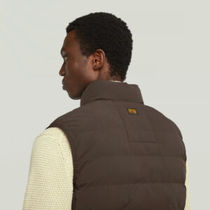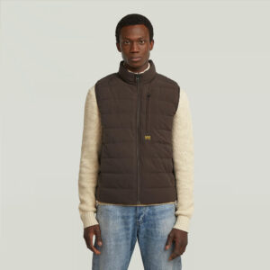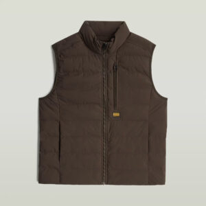 Nīderlandes zīmola G-Star Raw polsterēta vīriešu veste tumšā, šokolādes brūnā krāsā. Izgatavota no viegli kopjama un ilgtspējīga augstākās kvalitātes materiāla. Papildināta ar augstu apkakli, rāvējslēdzēja aizdari un vairākām kabatām. Akcentēta ar zīmola logotipa detaļām.
