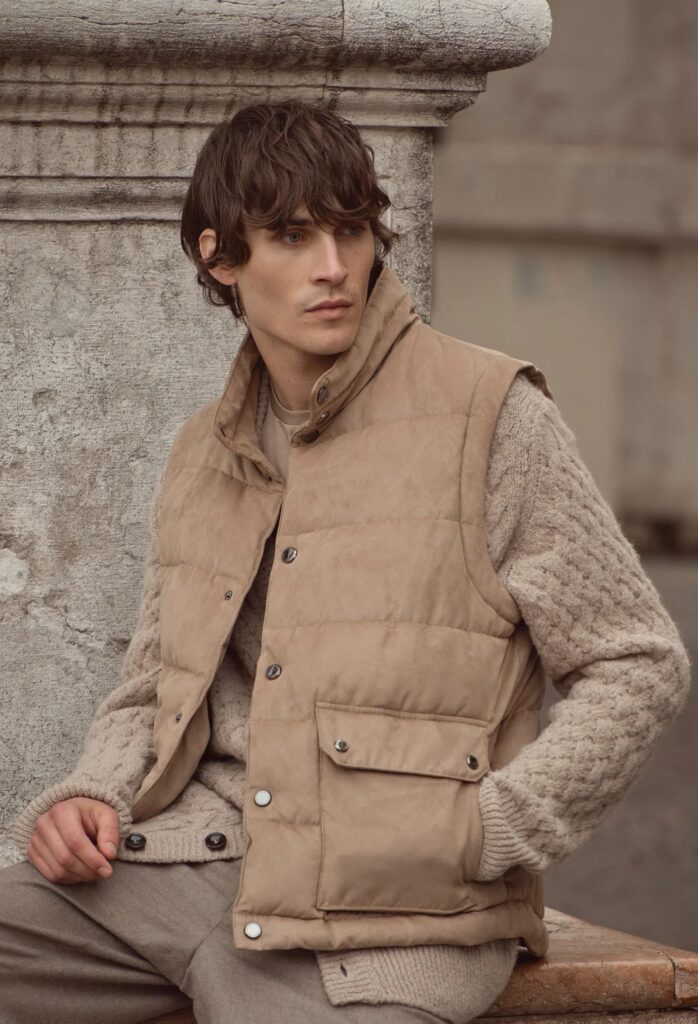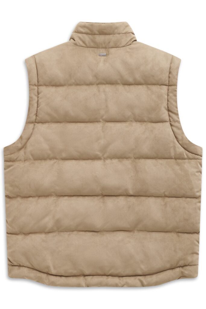 Vācu modes zīmola Bugatti polsterēta vīriešu veste ar horizontālu stepējumu bēšā krāsā. Izgatavota no poliestera materiāla ar mīkstu zamšveida tekstūru. Papildināta ar augstu apkakli, spiedpogu aizdari un dubultām sānu kabatām. Akcentēta ar sudraba krāsas metāla un zīmola logotipa detaļām.