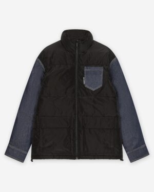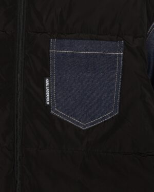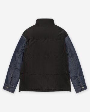 Vācu luksusa zīmola Karl Lagerfeld melna vīriešu ziemas virsjaka ar tumši zilām džinsu detaļām. Izgatavota no divu dažādu tekstūru materiāla. Papildināta ar augstu apkakli un savelkamu apakšmalu. Akcentēta ar dekoratīvām nošuvēm un zīmola logotipa detaļām.