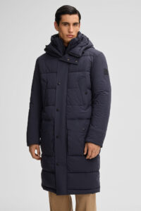 Vācu modes zīmola Bugatti vīriešu ziemas virsjaka- parka tumšā, nakts zilā krāsā. Izgatavota no vēju un ūdeni aizturoša materiāla. Papildināta ar biezu, savelkamu kapuci, košu oderi un diagonālu stepējumu.