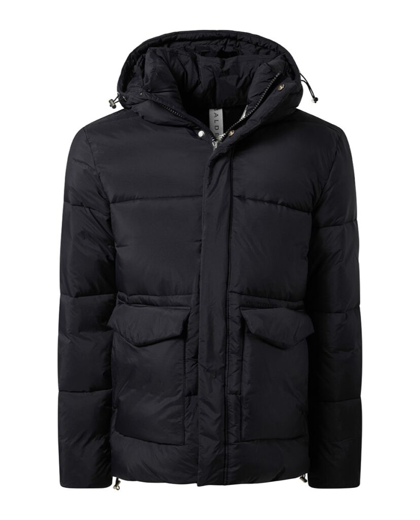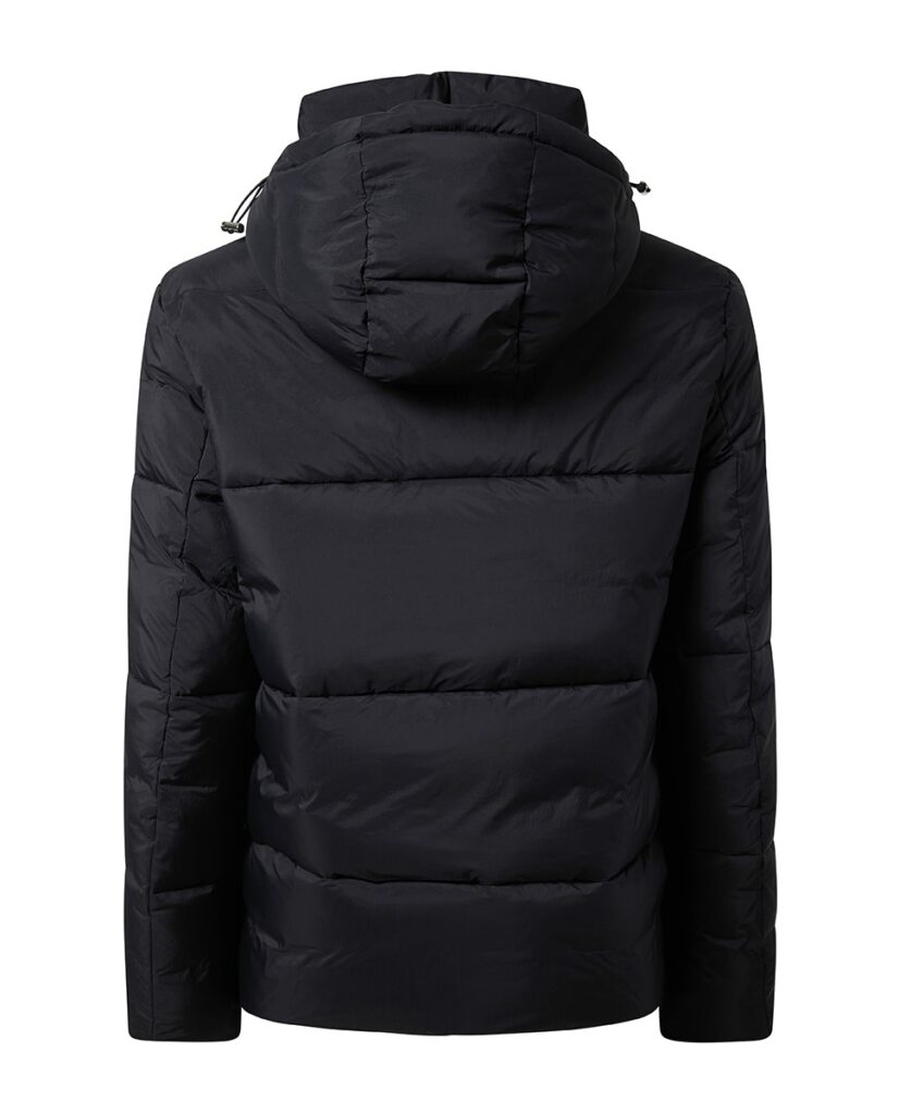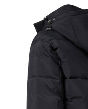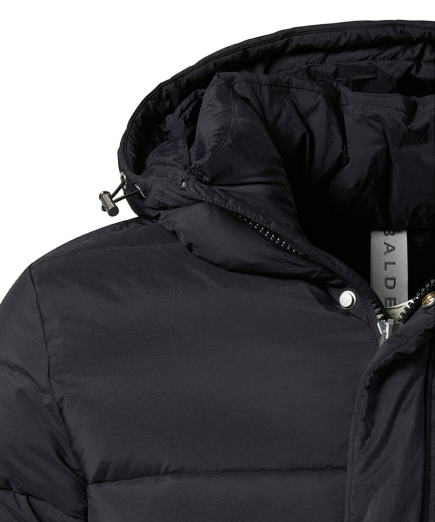 Austriešu premium klases modes zīmola Baldessarini bieza vīriešu ziemas virsjaka ar slēptu divvirziena rāvējslēdzēja aizdari melnā krāsā. Papildināta ar savelkamu kapuci un regulējamu apakšmalu, kā arī uzšūtām dubultām sānu kabatām. Akcentēta ar smalku zīmola logotipa izšuvumu pie kabatas.