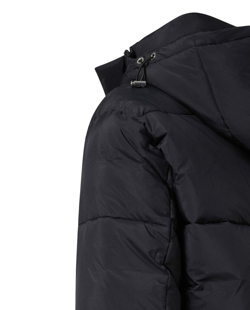 - Paaugstināta apkakle ar savelkamu kapuci un spiedpogu aizdari