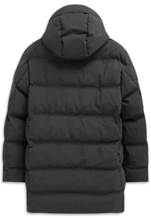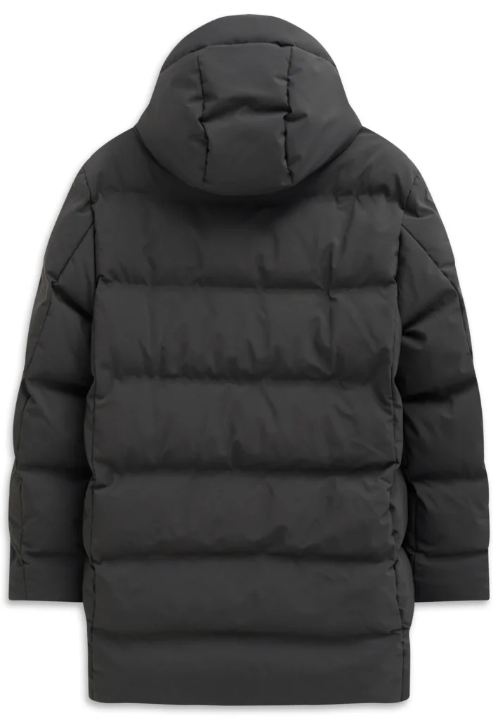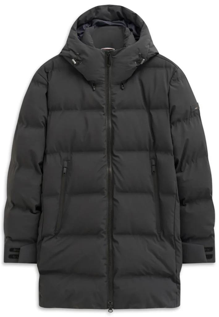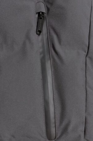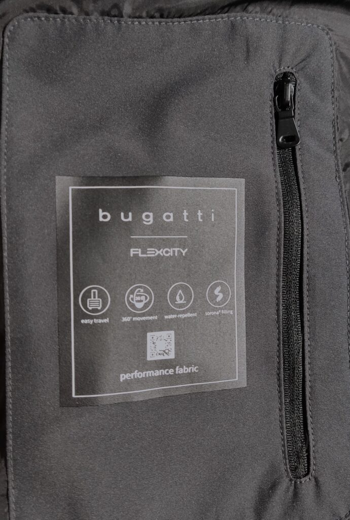 Vācu modes zīmola Bugatti polsterēta vīriešu ziemas virsjaka jeb parka tumši pelēkā, gandrīz melnā krāsā. Izgatavota no ūdeni atgrūdoša materiāla. Papildināta ar dubultā savelkamu kapuci un regulējamām līplentu aizdares aprocēm. Akcentēta ar zīmola logotipa detaļām.