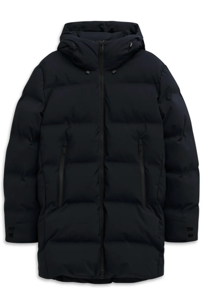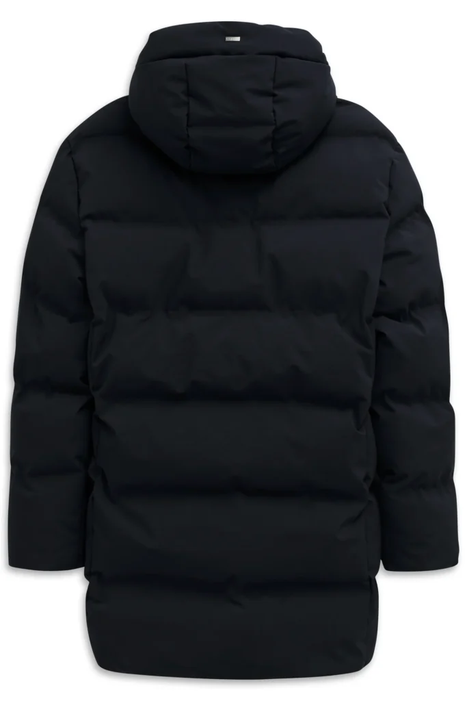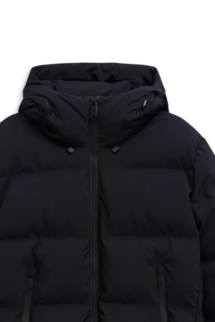 Vācu modes zīmola Bugatti polsterēta vīriešu ziemas virsjaka jeb parka tumši zilā krāsā. Izgatavota no ūdeni atgrūdoša materiāla. Papildināta ar dubultā savelkamu kapuci un regulējamām līplentu aizdares aprocēm. Acentēta ar zīmola logotipa detaļām.
