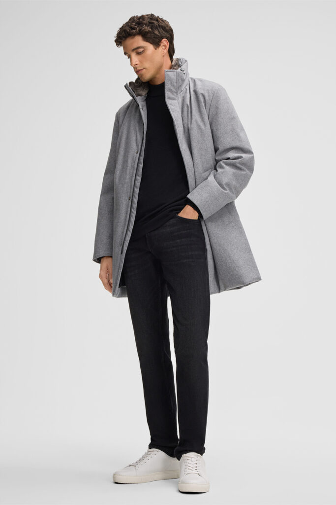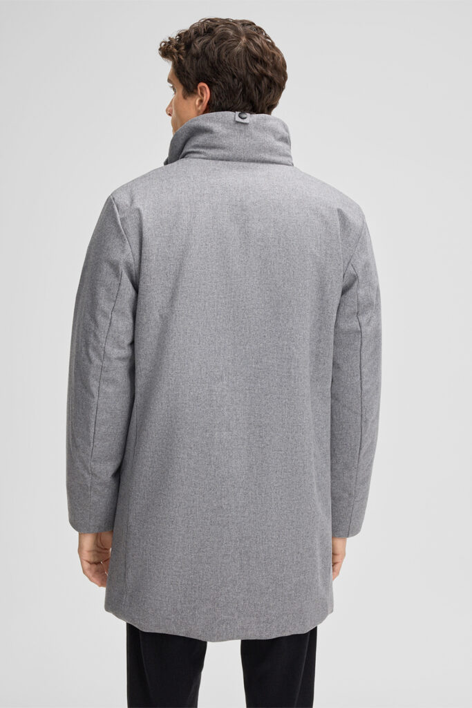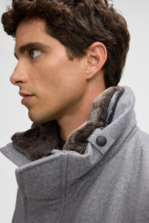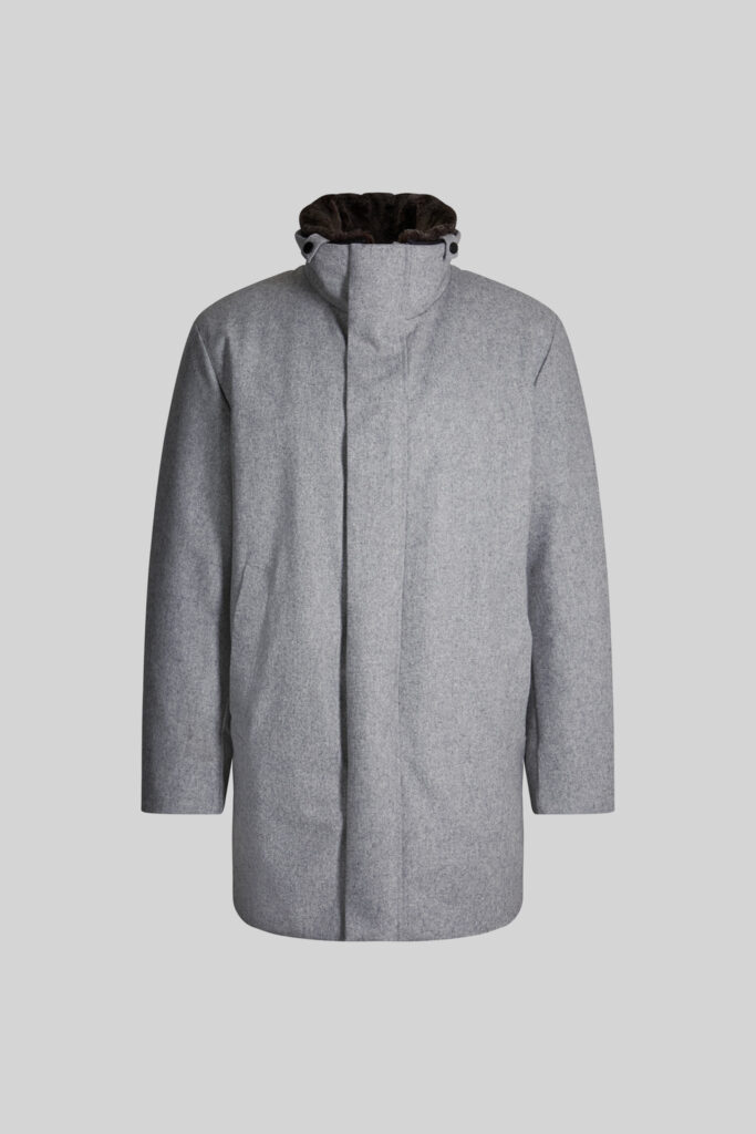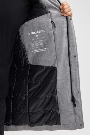 Šveices modes zīmola Strellson viegli siltināta vīriešu virsjaka jeb parka pelēkā krāsā. Izgatavota no no vēju un ūdeni aizturoša vilnas maisījuma materiāla ar izteikti matētu struktūru. Papildināta ar noņemamu mākslīgās kažokādas apkakli un zīmola logotipa detaļām.