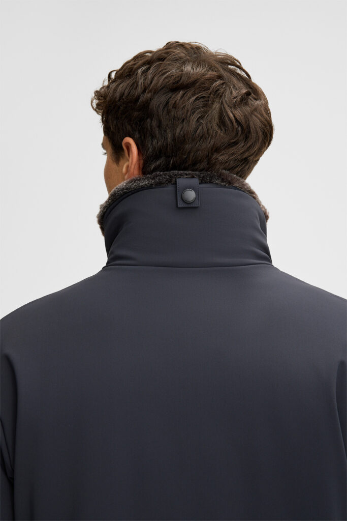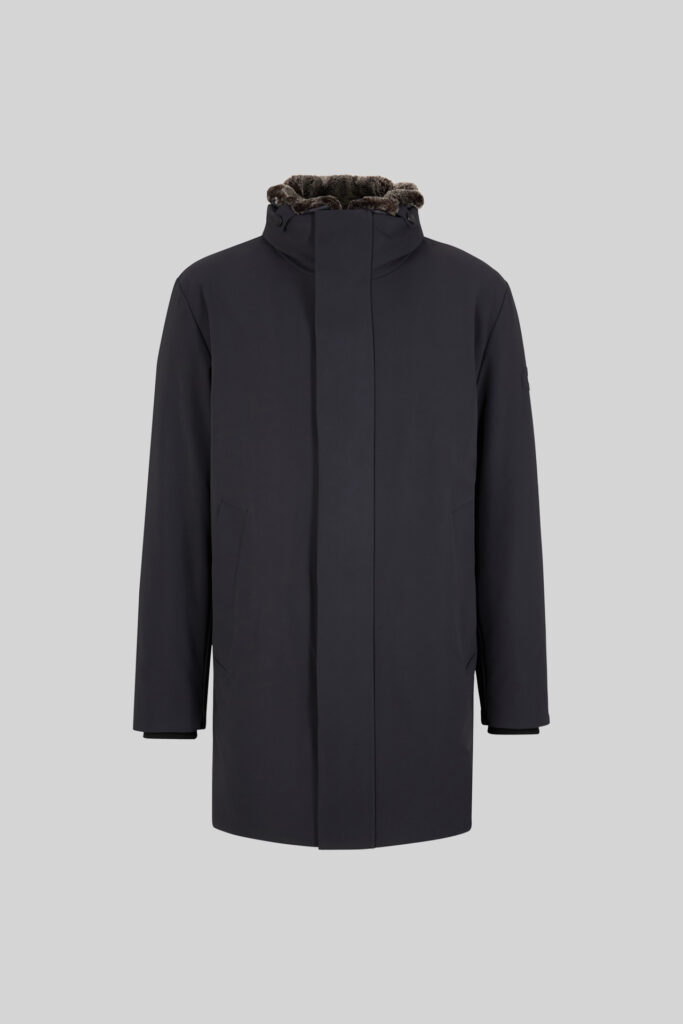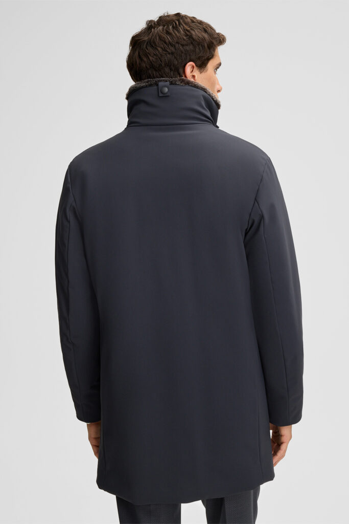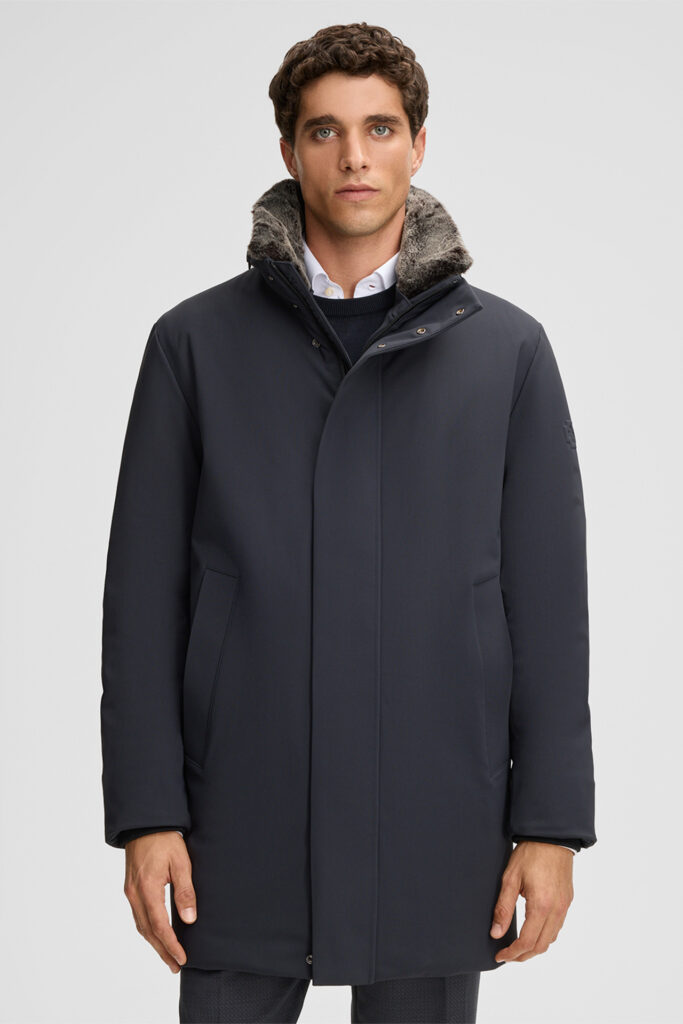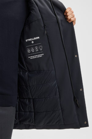 Šveices modes zīmola Strellson pusgara vīriešu ziemas virsjaka jeb parka tumši zilā krāsā. Izgatavota no vēju un ūdeni aizturoša materiāla ar stepētu polsterējumu. Papildināta ar noņemamu mākslīgās kažokādas apkakli.
