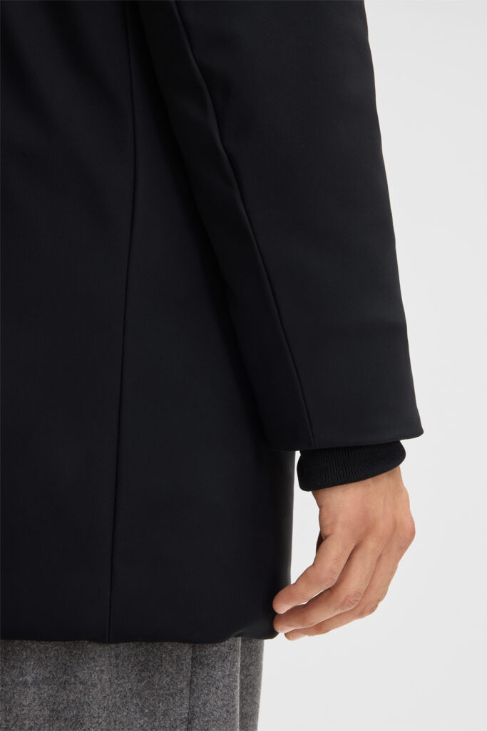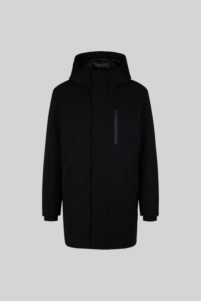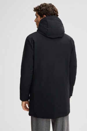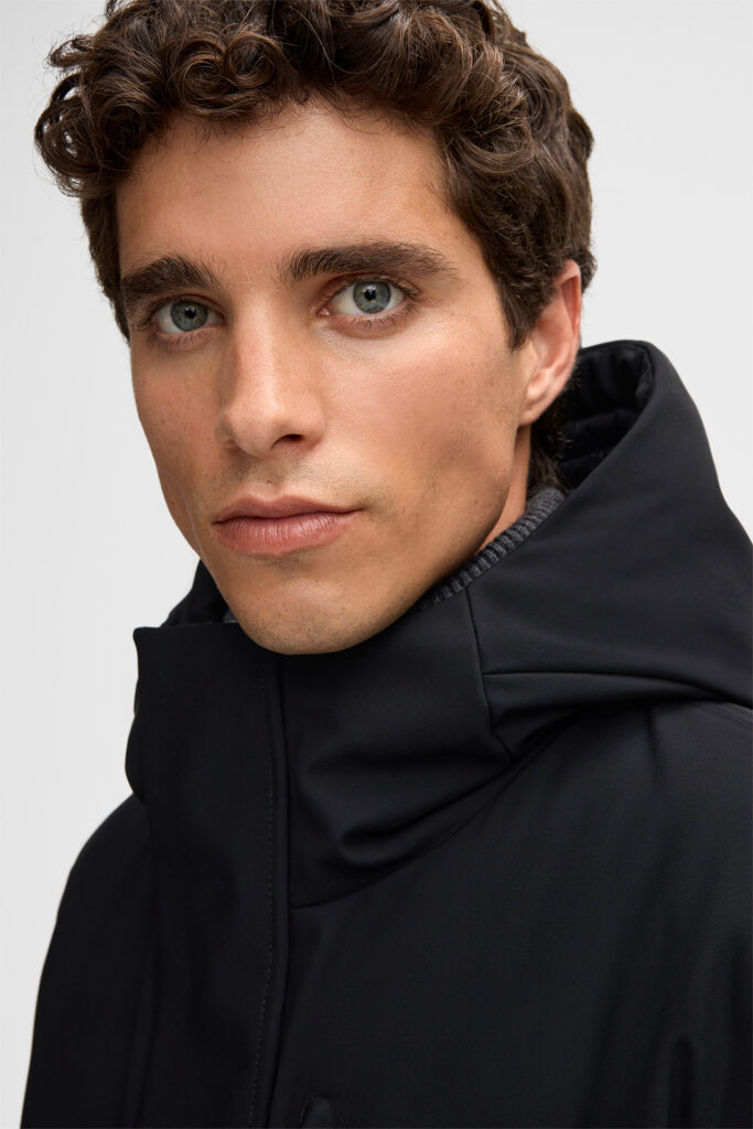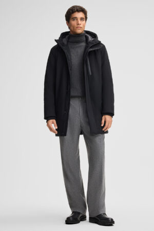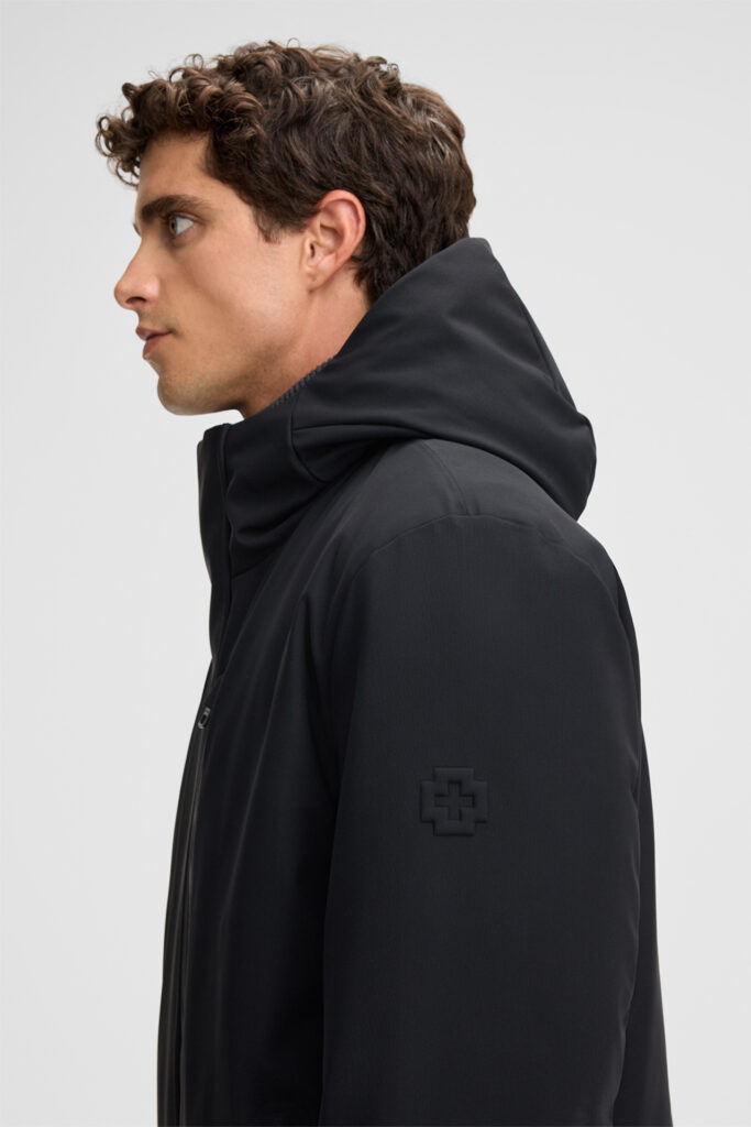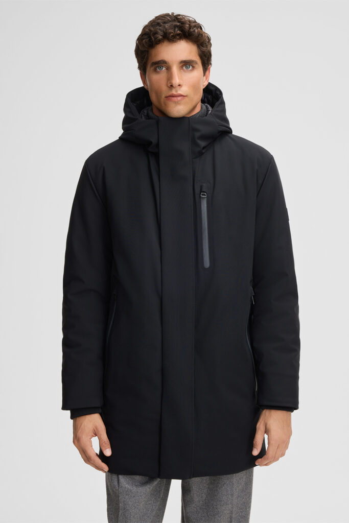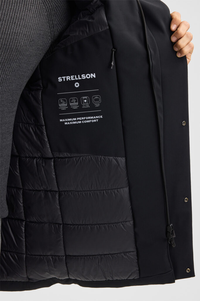 Šveices modes zīmola Strellson pusgara vīriešu ziemas virsjaka jeb parka ar kapuci melnā krāsā. Izgatavota no vēju un ūdeni aizturoša materiāla ar siltu polsterējumu. Papildināta ar slēptu aizdari un rievotām iekšējām aprocēm.