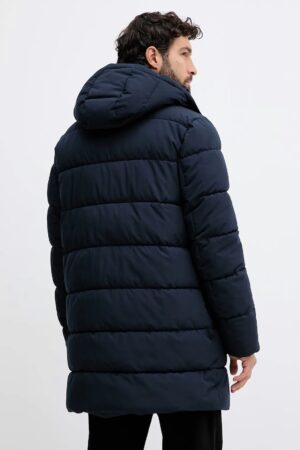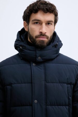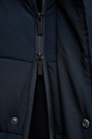 Vācu luksusa zīmola Karl Lagerfeld tumši zila vīriešu ziemas virsjaka jeb parka ar noņemamu savelkamo kapuci un noņemamu mākslīgās kažokādas apkakli. Papildināta ar daudzām kabatām un elastīgām iekšējām aprocēm. Akcentēta ar zīmola logotipa detaļām.