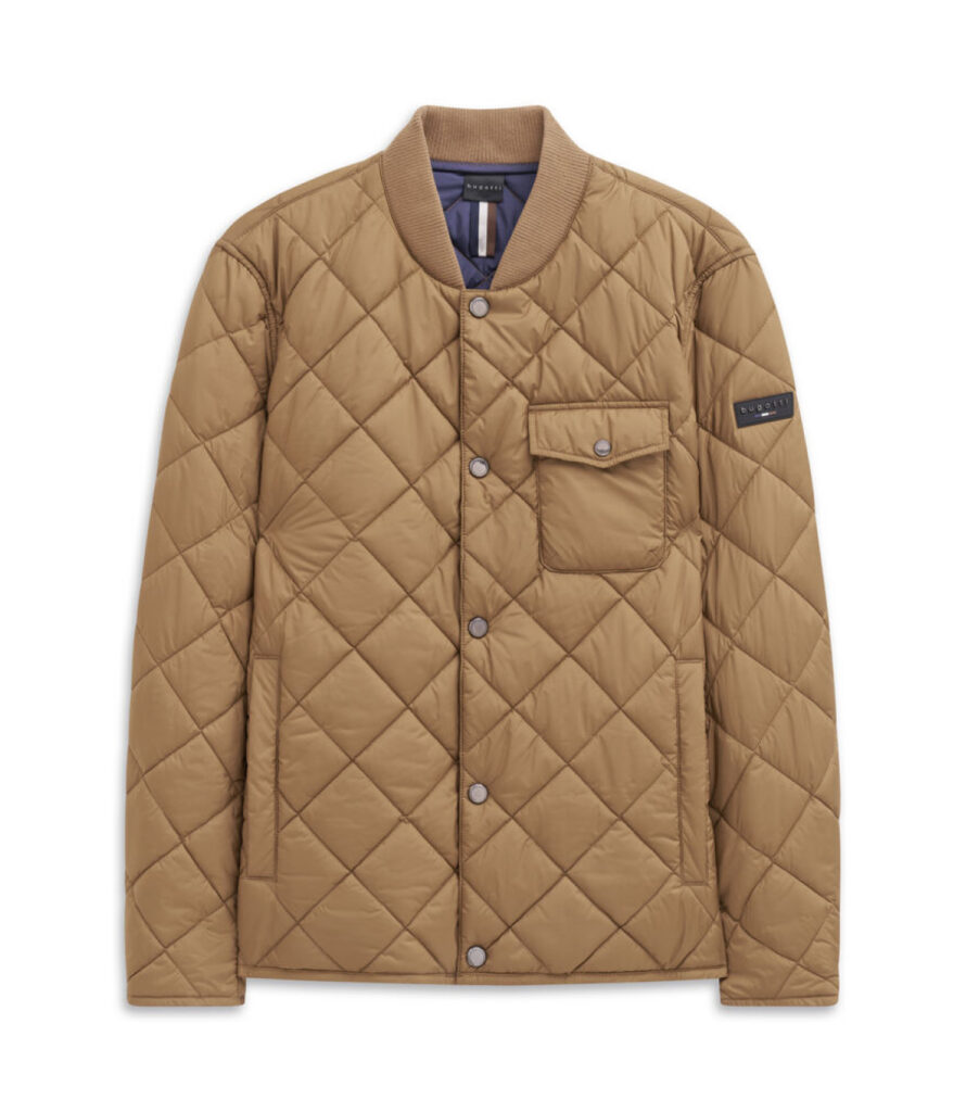 Vācu modes zīmola Bugatti gaiši brūna vīriešu virsjaka ar diagonālu kvadrātveida stepējumu un spiedpogu aizdari. Izgatavota no viegli siltināta poliestera materiāla. Papildināta ar rievota adījuma apkakli un uzšūtu krūšu kabatu, kā arī zīmola logotipa emblēmu uz piedurknes.