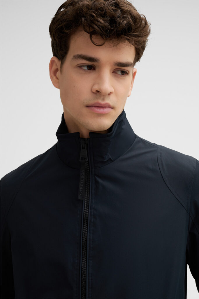 Šveices modes zīmola Strellson tumši zila vīriešu vējjaka ar augstu apkakli un rāvējslēdzēja aizdari. Izgatavota no vēja un ūdens necaurlaidīga materiāla. Papildināta ar daļēji elastīgu, smalki rievotu apdari un regulējamām spiedpogu aizdares aprocēm. Akcentēta ar zīmola logotipa detaļām.