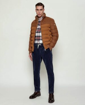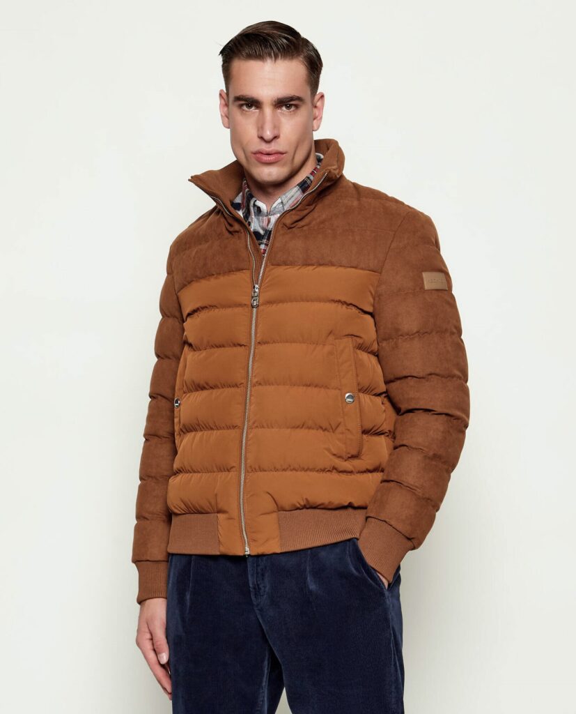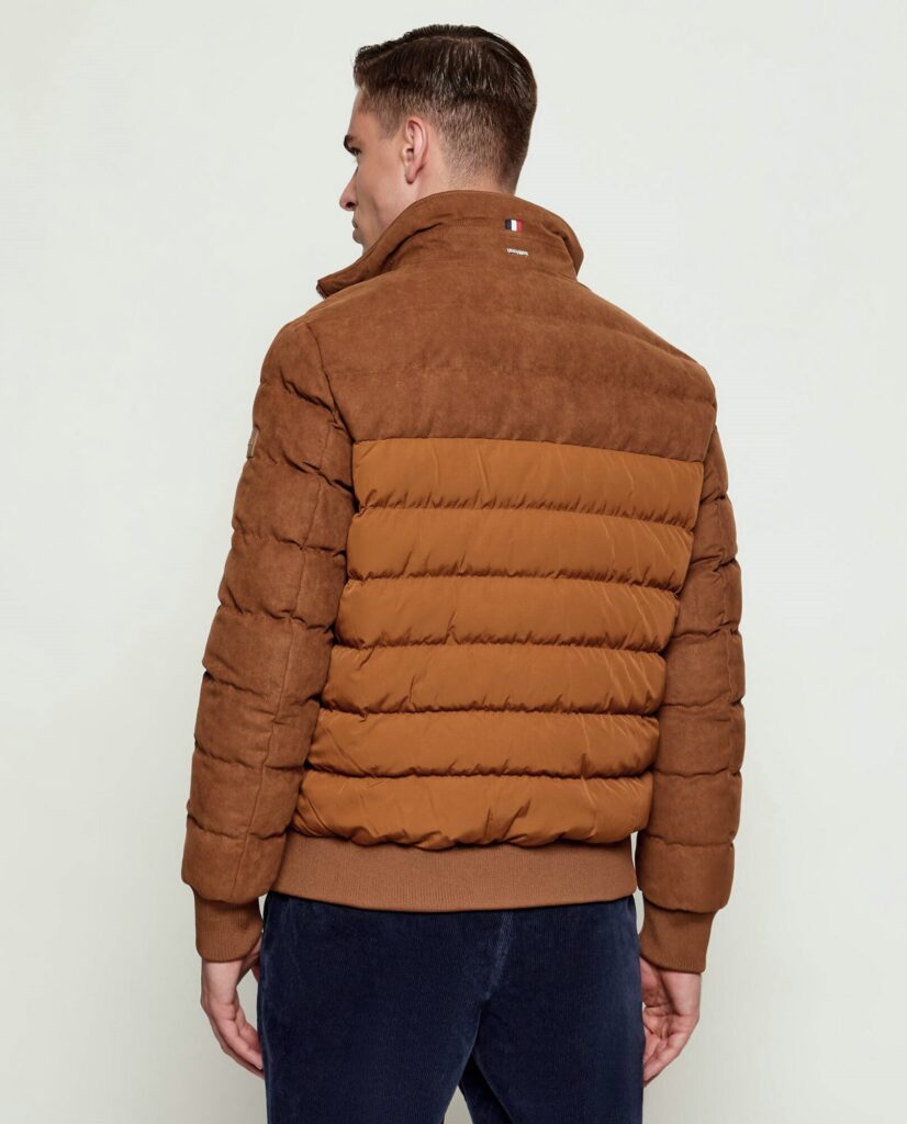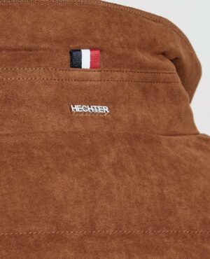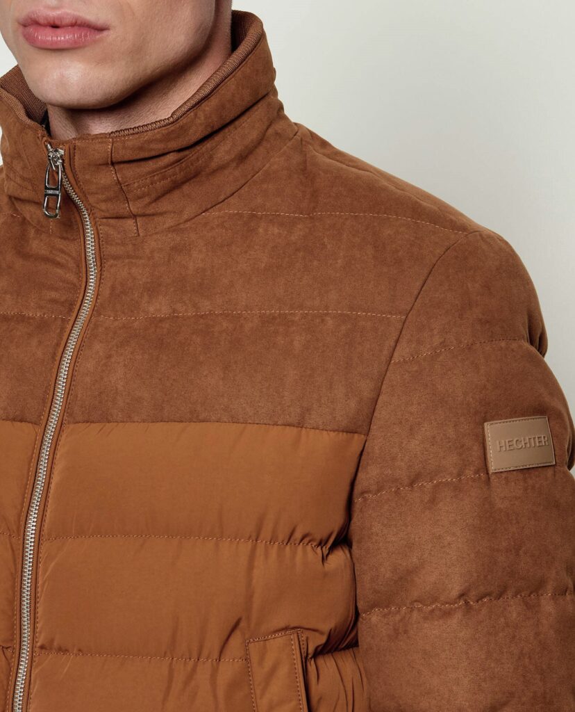 Franču zīmola HECHTER PARIS polsterēta vīriešu virsjaka zeltaini brunā krāsā. Izgatavota no viegla un elpojoša poliestera materiāla ar gludu un zamšādas imitācijas tekstūru. Papildināta ar augstu apkakli un rievota adījuma apdari. Akcentēta ar sudraba krāsas metāla un zīmola logotipa detaļām.