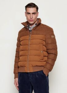 Franču zīmola HECHTER PARIS stepēta ziemas virsjaka vīriešiem gaiši bēšā krāsā ar kontrastējošiem krāsu akcentiem un noņemamu kapuci. Papildināta ar horizontālām nošuvēm un zīmola logotipa detaļām.