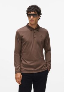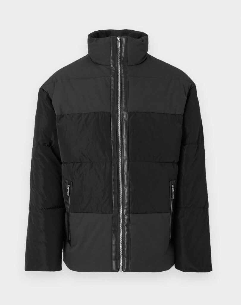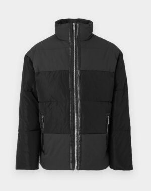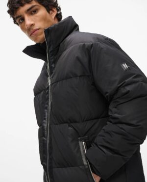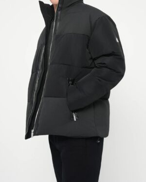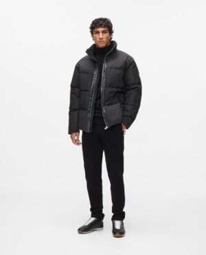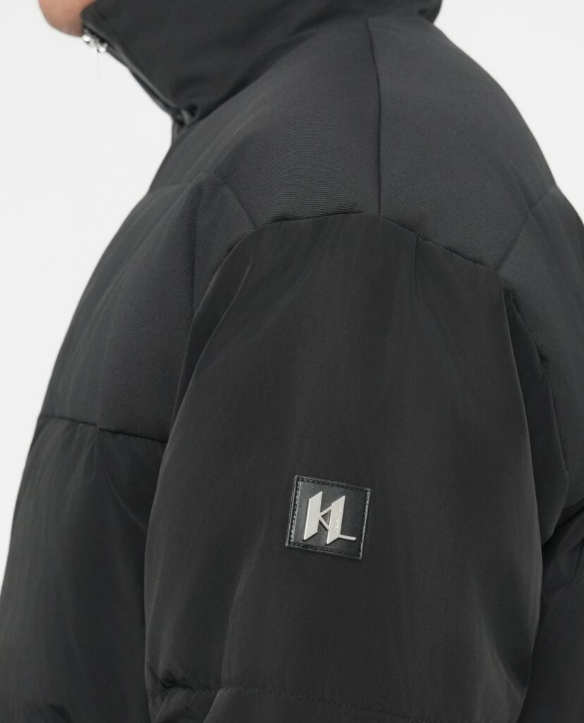 Vācu luksusa zīmola Karl Lagerfeld melna vīriešu ziemas virsjaka ar augstu apkakli un savelkamu apakšmalu. Izgatavota no divu dažādu tekstūru materiāla. Papildināta ar akcentētu rāvājslēdzēju aizdari, kā arī sudraba krāsas metāla un zīmola logotipa detaļām.