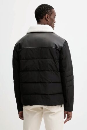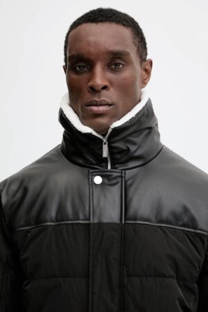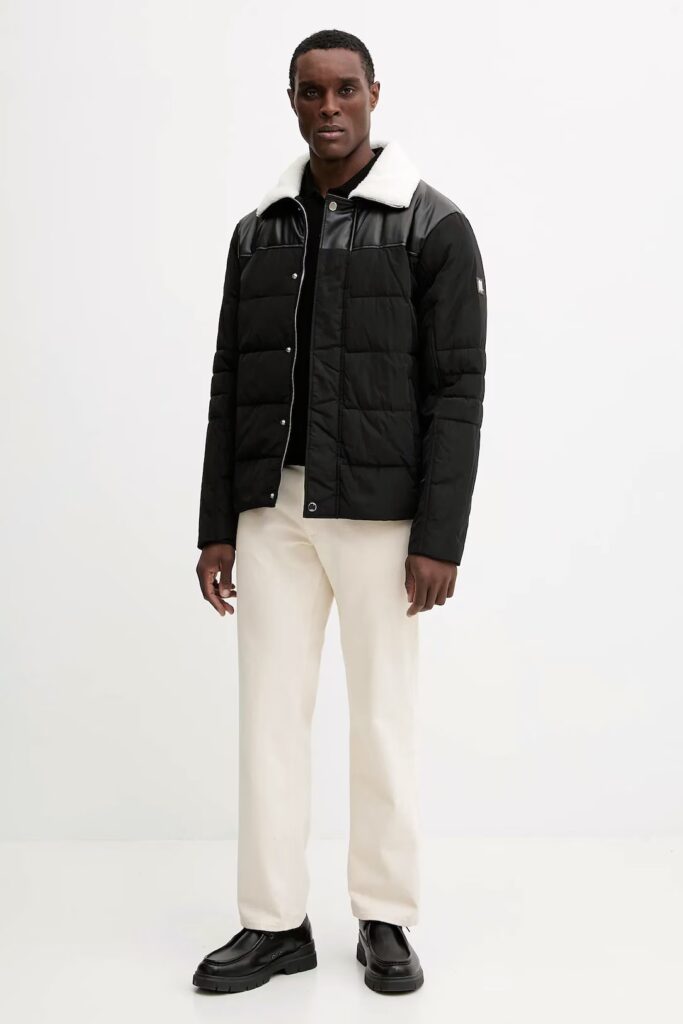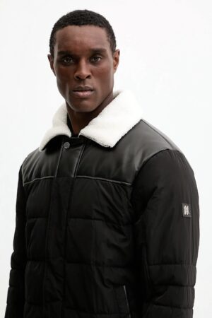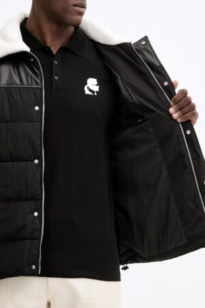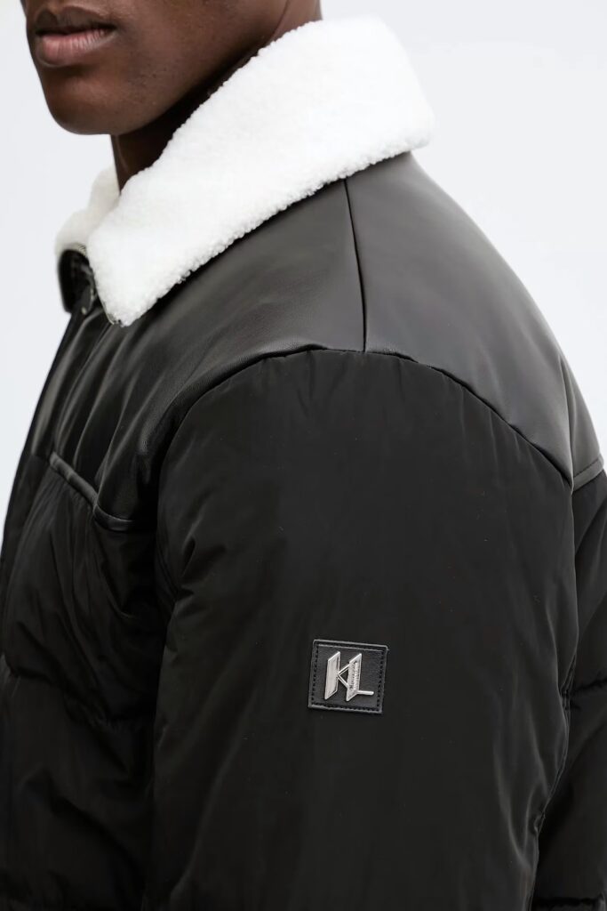 Vācu luksusa zīmola Karl Lagerfeld melna vīriešu virsjaka ar baltu mākslīgās kažokādas apkakli un savelkamu apakšmalu. Akcentēta ar ādas imitācijas apdari plecu daļā, kā arī sudraba krāsas metāla un zīmola logotipa detaļām.