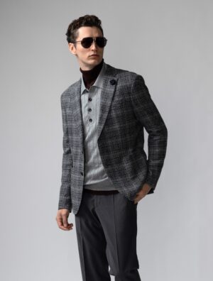 Vācu modes zīmola Joop! viegli pieguļoša vīriešu žakete pelēkā krāsā ar melni violetu rūtotu rakstu. Izgatavota no vilnas maisījuma materiāla. Papildināta ar uzšūtām kabatām un dekoratīvu melna zieda akcentu pie atloka.