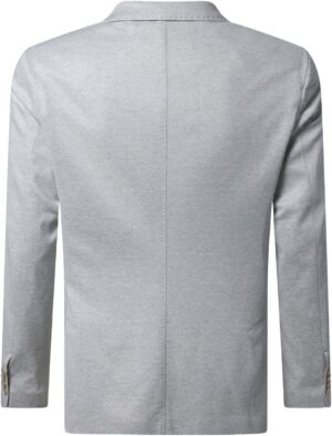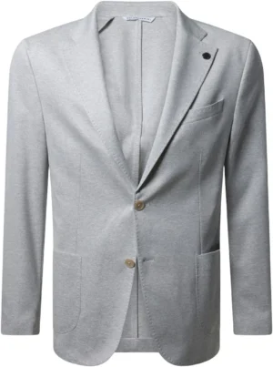 Austriešu premium klases modes zīmola Baldessarini gaiši pelēka vīriešu žakete bez oderes. Izgatavota no Itālijā ražota augstākās kvalitātes viskozes maisījuma melanža materiāla. Papildināta ar dekoratīvām nošuvēm un šķēlumiem mugurpusē. Akcentēta ar sudraba krāsas metāla piespraudi.