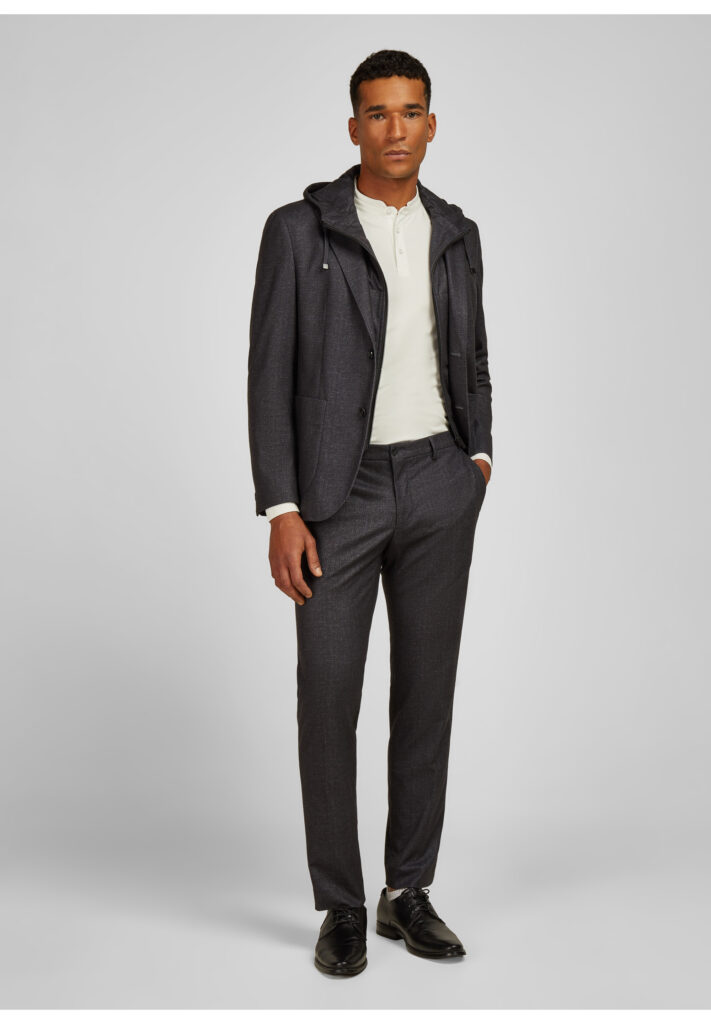 Franču zīmola HECHTER PARIS divējādi nesājama vīriešu žakete ar noņemamu vestes un kapuces daļu. Izgatavota no mīksta un elastīga materiāla ar viegli raibu rakstu tumši pelēkā krāsā.