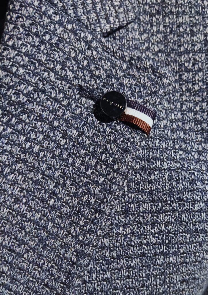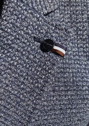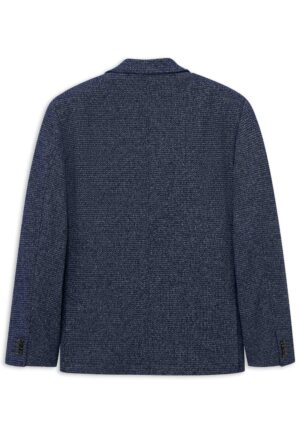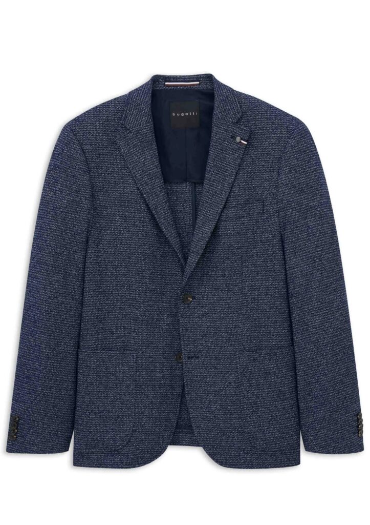 Vācu modes zīmola Bugatti tumši pelēkzila vīriešu žakete ar raibu struktūru. Izgatavota no viegla kokvilnas maisījuma materiāla ar raupju tekstūru. Papildināta ar daļēju oderi, uzšūtām sānu kabatām un šķēlumiem mugurpusē. Akcentēta ar zīmola logotipa detaļām.
