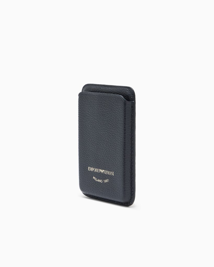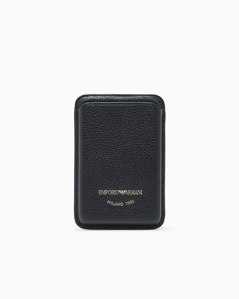 Itāļu luksusa zīmola Emporio Armani melns dabīgās ādas karšu maciņš ar magnētisko turētāju un sietspiedes logotipu zelta krāsā. Ievietots pelēkā dāvanu kastītē.