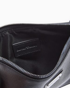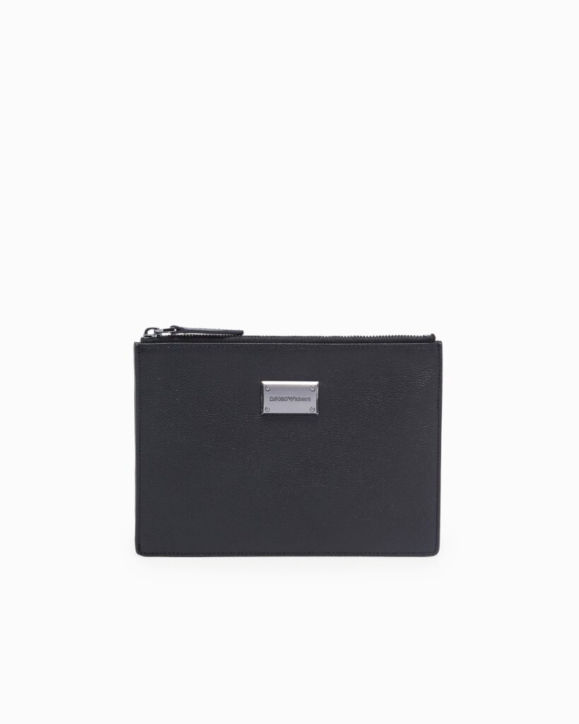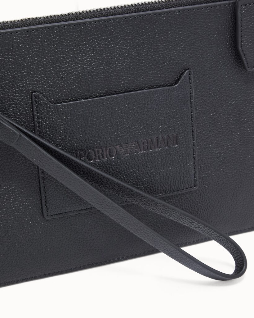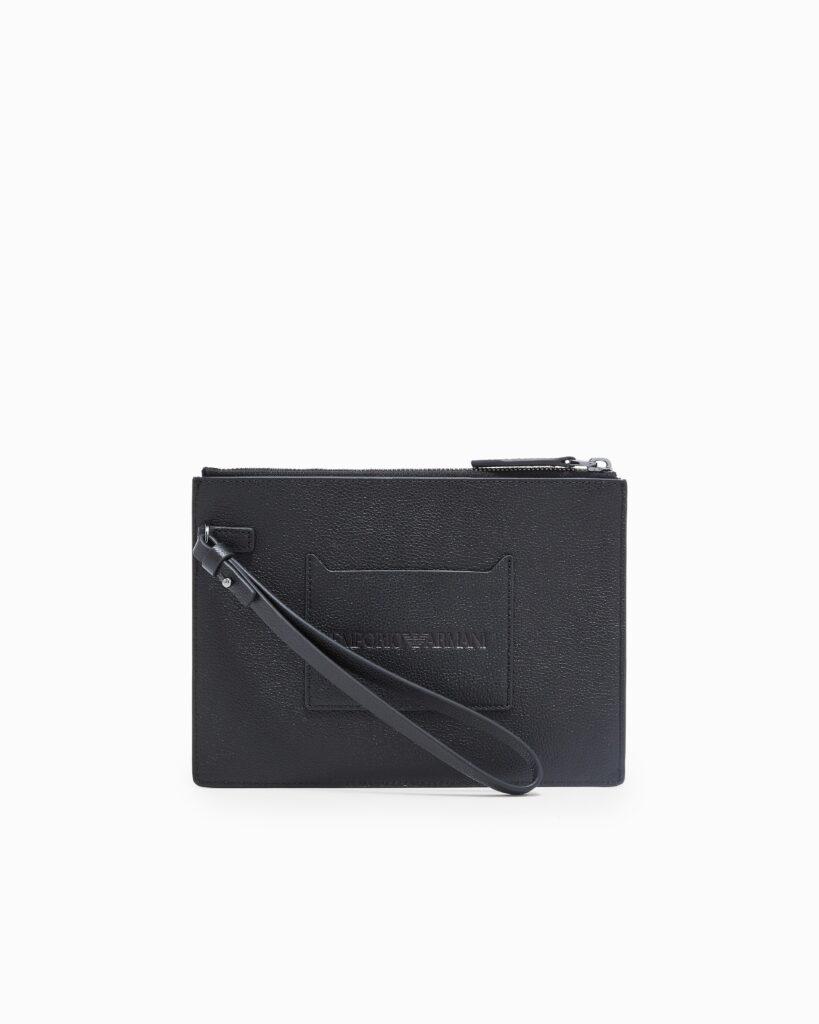 Itāļu luksusa zīmola Emporio Armani melna vīriešu plaukstas somiņa dokumentiem, banknotēm vai personīgiem piederumiem. Izgatavota no dabīgās ādas ar raupju struktūru. Papildināta ar rāvējslēdzēja aizdari un nelielu ārējo nodalījumu. Akcentēta ar zīmola logotipa detaļām.