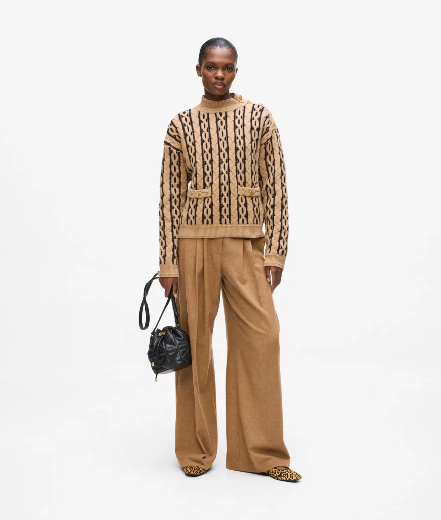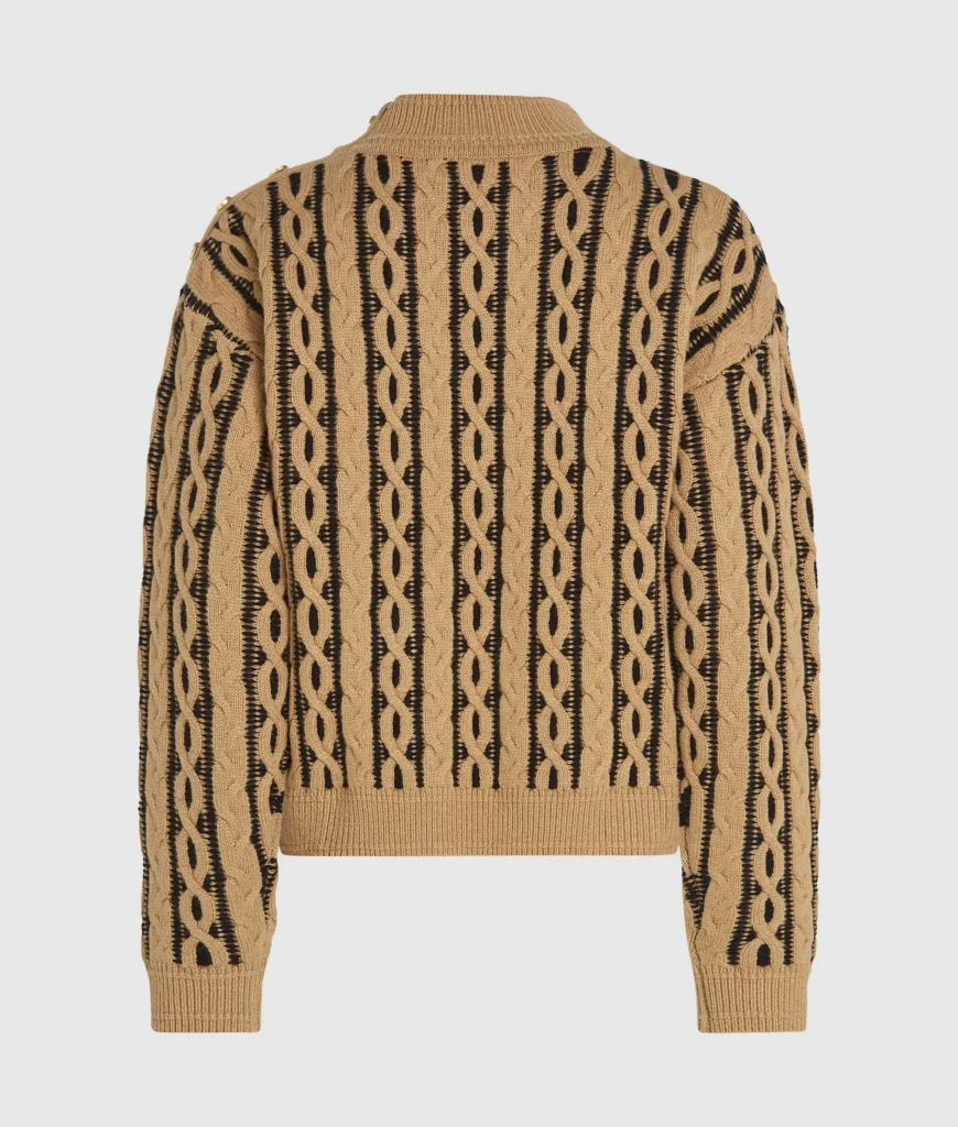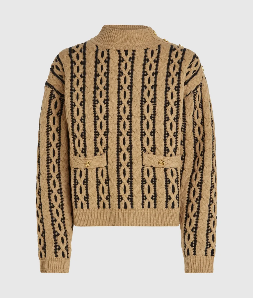 Vācu luksusa zīmola Karl Lagerfeld smilšu brūns sieviešu džemperis ar paaugstinātu apkakli un kontrastējošu pīņu adījuma rakstu. Izgatavots no mīkstas un siltas vilnas maisījuma dzijas. Papildināts ar rievotu apdari un zīmola logotipa zelta krāsas pogu akcentiem.