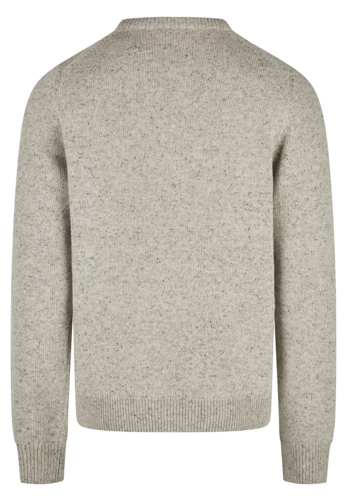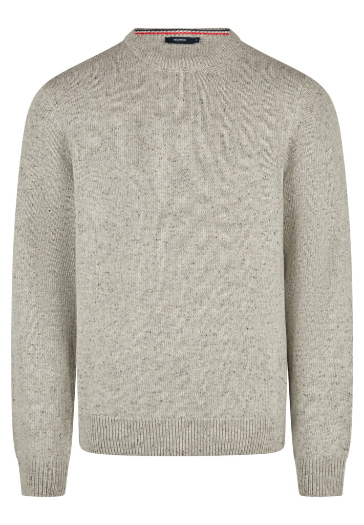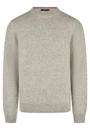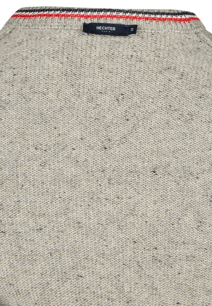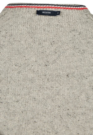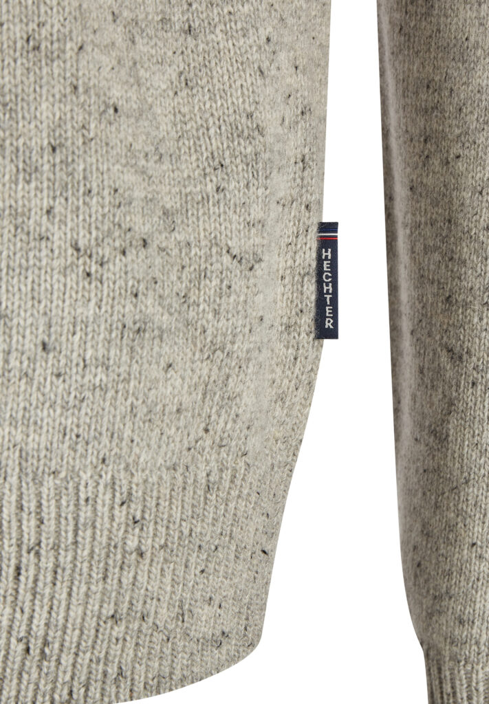Franču zīmola HECHTER PARIS adīts klasiska dizaina džemperis gaiši pelēkā krāsā ar smalki raibu struktūru. Izgatavots no vilnas un viskozes maisījuma dzijas. Papildināts ar smalki rievotu apdari un zīmola emblēmu sānu vīlē.