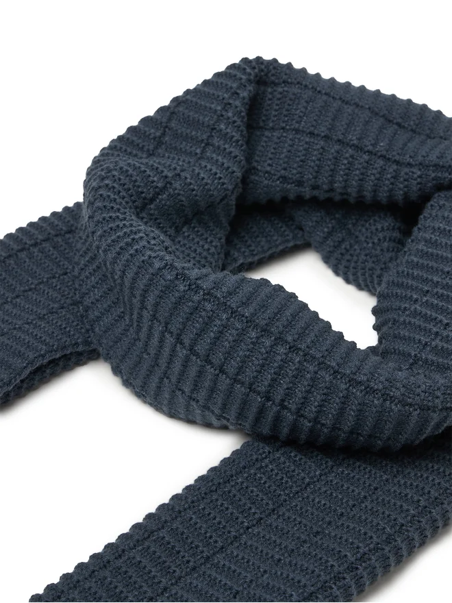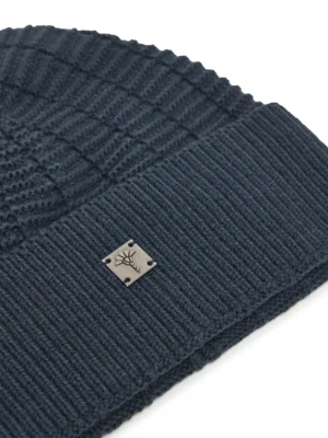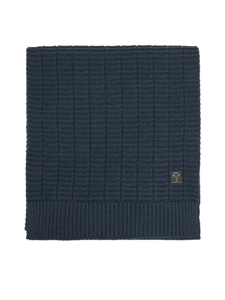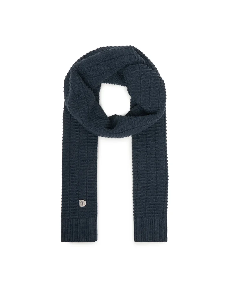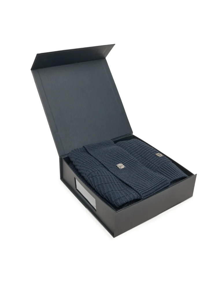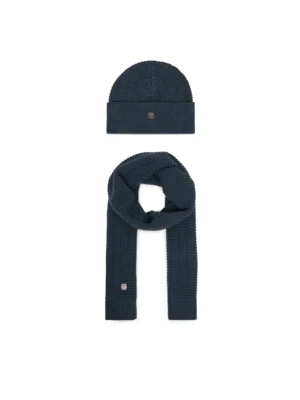 Vācu modes zīmola Joop! tumši pelēcīgi zils šalles un cepures komplekts vīriešiem. Izgatavots no vilnas maisījuma dzijas grafiskā adījuma rakstā. Papildināts ar smalki rievotu apdari un ikoniskā zīmola logotipa- rudzupuķes metāla akcentu.