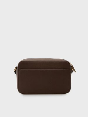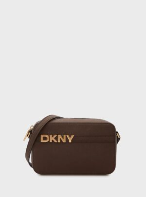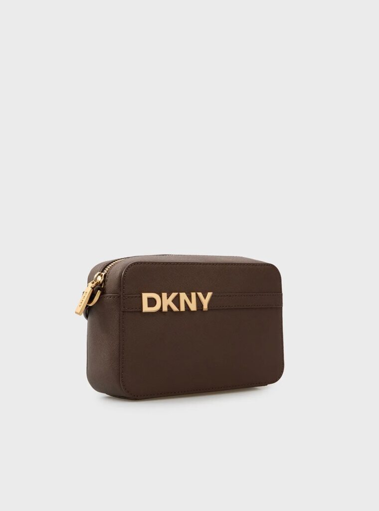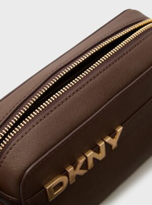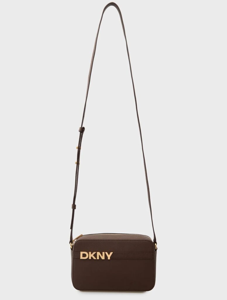 ASV modes zīmola DKNY kompakta taisnstūrveida plecu somiņa šokolādes brūnā krāsā. Izgatavota no stingra dabīgās ādas materiāla ar smalki rievotu struktūru. Papildināta ar regulējamu plecu siksnu, kā arī zelta krāsas apdares un zīmola logotipa detaļām.
