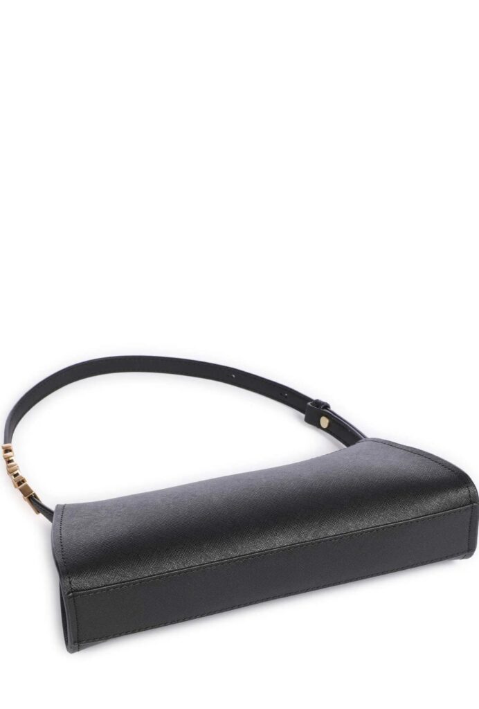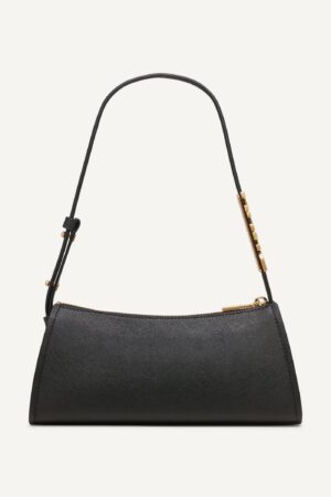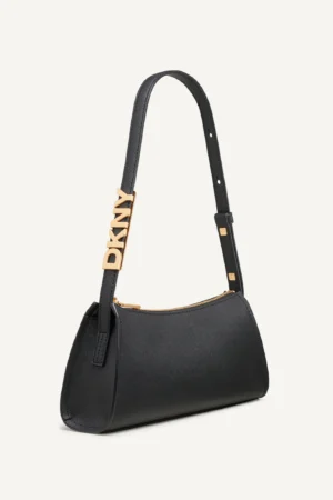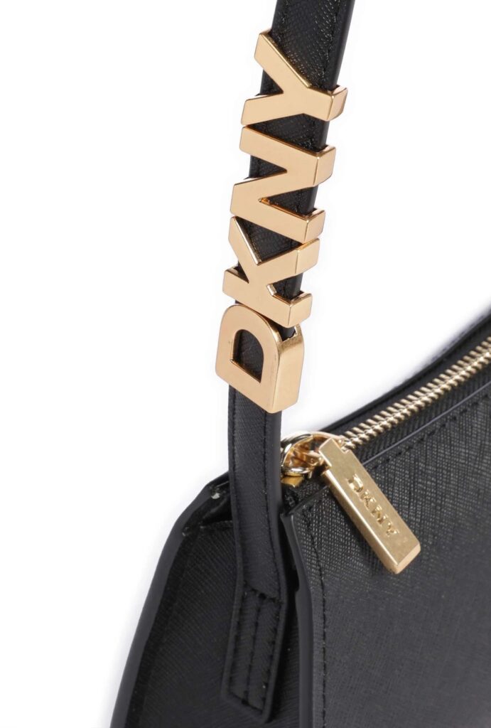 ASV modes zīmola DKNY neliela sieviešu rokassomiņa melnā krāsā. Izgatavota no stingra materiāla ar dabīgās ādas pārklājumu un smalki rievotu struktūru. Papildināta ar regulējamu rokturi- plecu siksnu, kā arī matētām zelta krāsas apdares un zīmola logotipa detaļām.