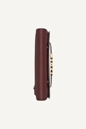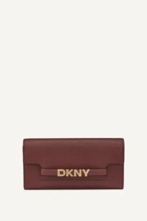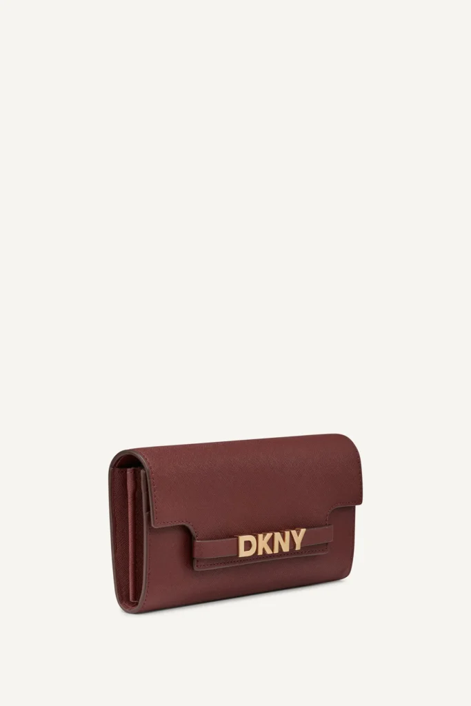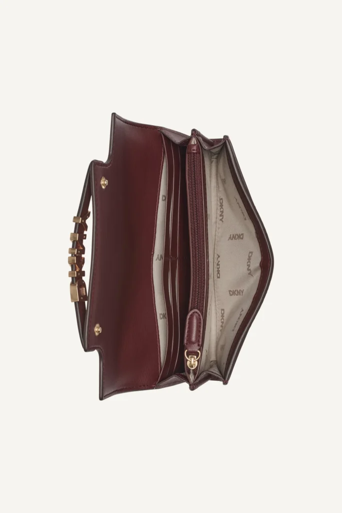 ASV modes zīmola DKNY sieviešu naudas maks bordo krāsā. Izgatavots no stingra materiāla ar dabīgās ādas pārklājumu un smalki rievotu struktūru. Papildināts ar banknošu, karšu un monētu nodalījumiem. Akcentēts arī matētām zelta krāsas apdares un zīmola logotipa detaļām. Ievietots melnā dāvanu kastītē.
