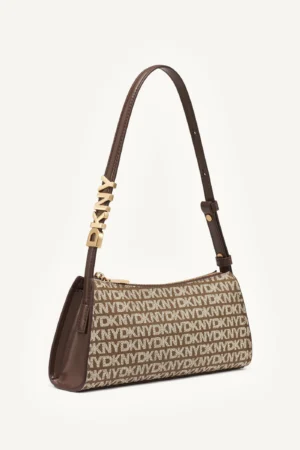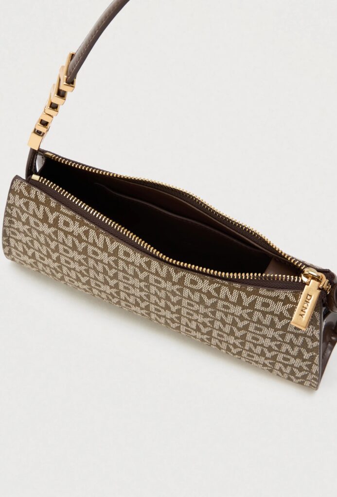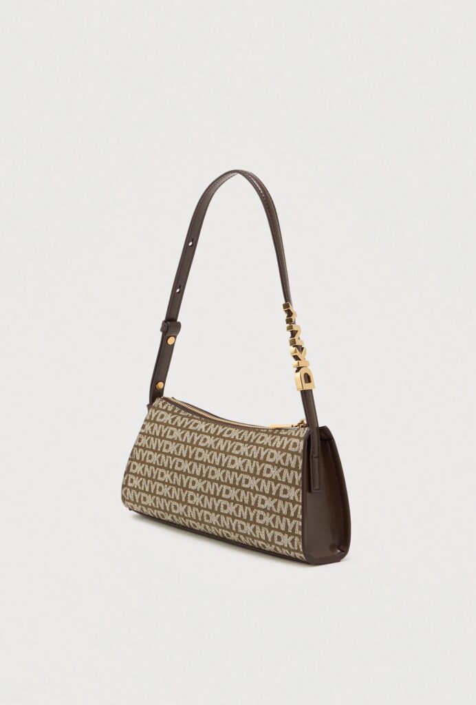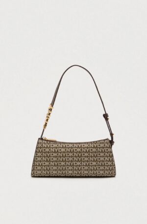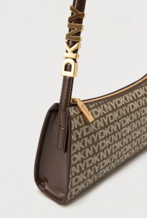 ASV modes zīmola DKNY neliela sieviešu rokassomiņa tumši brūnā krāsā ar pelēkbēšu logo rakstu. Izgatavota no stingra materiāla ar dabīgās ādas pārklājumu un smalki rievotu struktūru. Papildināta ar regulējamu rokturi- plecu siksnu, kā arī matētām zelta krāsas apdares un zīmola logotipa detaļām.